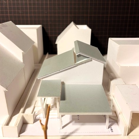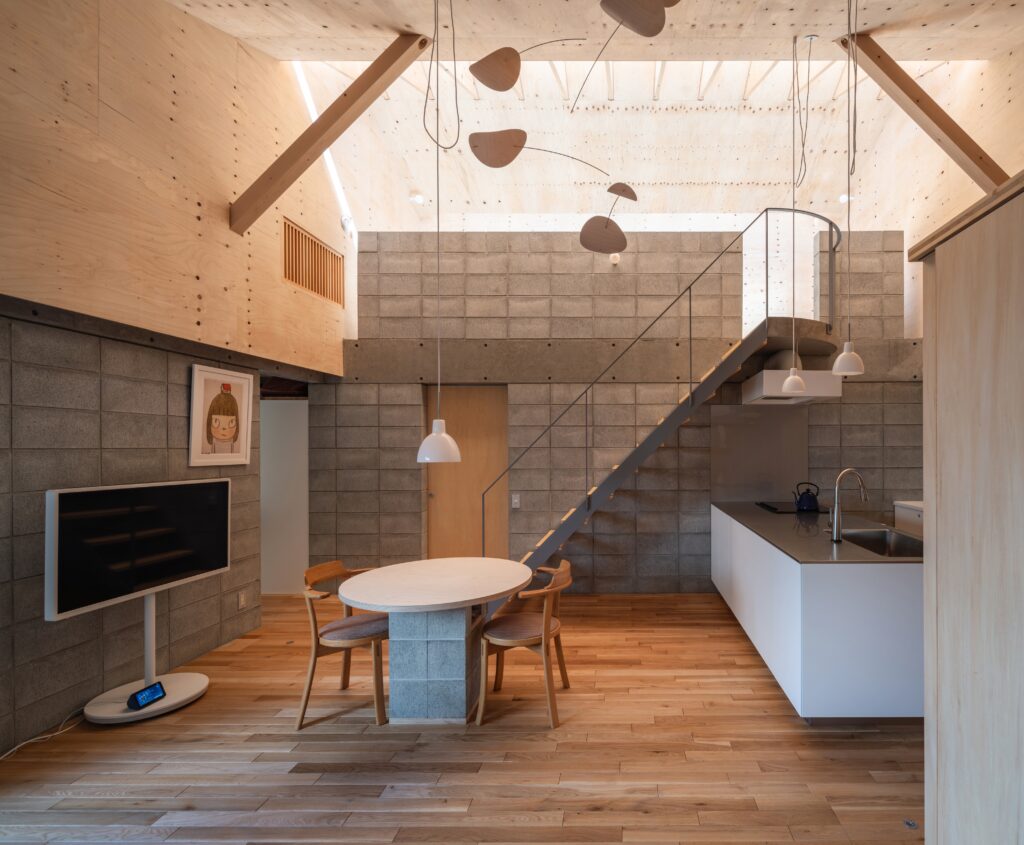 私たち設計事務所の仕事は、毎日の現場作業が完了しクライアントへ完成建築を引き渡すと、一区切りします。その後の完成建築との関わりは、定期点検や維持管理を除くとほとんど無くなります。その時、私たちの手元には設計図書と写真などの記録だけが残ります。写真家・酒井広司さんに撮影していただいた居間の写真を眺めながら、私はふと考えています。クライアントと多大な時間を費やして話し合い、私たちが知恵を絞って提案したことがうまく建築として実現しているだろうか。今回も満点とはいかないまでも及第点はクリアしているようだ。竣工時の写真は私たちにとって自己採点の絶好の機会でもあります。 1階居間の四方は、10段積されたコンクリートブロック壁。南西側壁の一部は開口部とし、他の壁面はプライバシーを守る観点からコンクリ―ブロック壁としました。壁上部と天井は北海道産トドマツ合板仕上。天井はカラマツ無垢材によるステイ(方杖)で構造形式を表現しています。さらに天井にハイサイドライトを組み込み、そこからの自然光が2階奥に反射拡散し居間全体に逆光の影をつくりました。コンクリートブロック開口部とハイサイドライトの自然光が、食卓と椅子・対面式キッチン・TVスタンド・そして45度の階段が並置されているのを照らします。北国の居間は、冬場の長時間を過ごすさまざまな生活シーンの舞台であり、住宅の中心室としていわば都市の通りや広場のような役割を果たしていると考えています。通りや広場が居間なのだなあと、写真を眺めていると、イタリアの都市の通りが透視図法で描かれ、前方からの45度の光と影が印象的な絵画が思い浮かびました。輪回し少女といえば誰でも知っている有名な「通りの神秘と憂愁」というデ・キリコの絵画です。評論家の多木浩二氏は「都市や建築を考える人間に不思議な刺激を与える(絵)」(集英社:現代世界の美術第17集所収/記憶と忘却)と評しています。そして居間の写真とデ・キリコの画集を見比べながらの楽しい時間のなかで、豊かな日常が繰り広げられる住宅の居間になることを信じているのです。