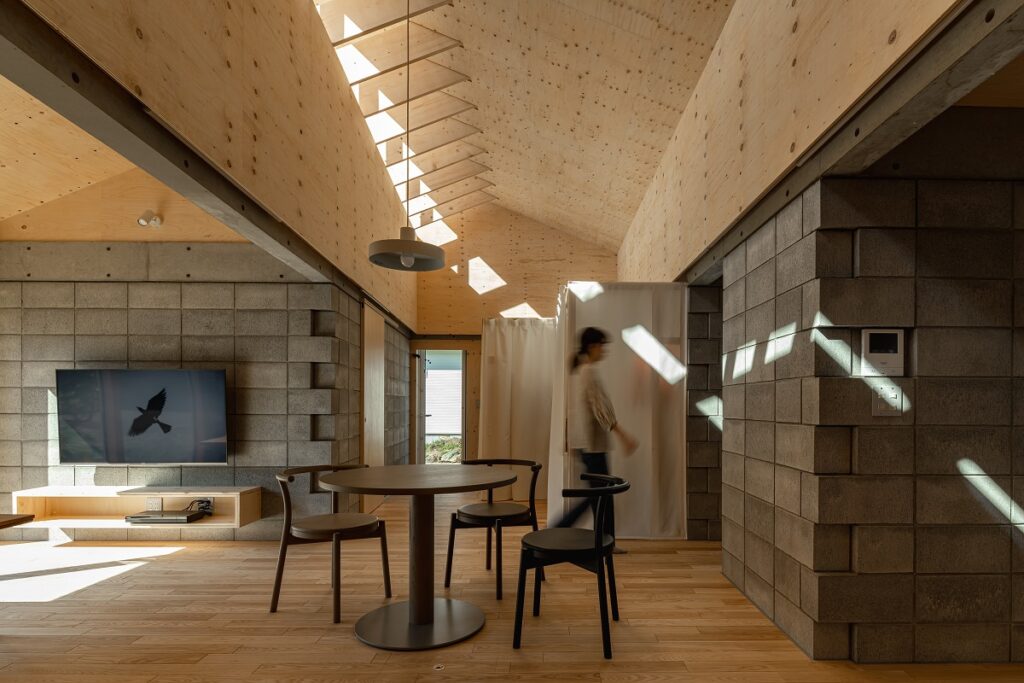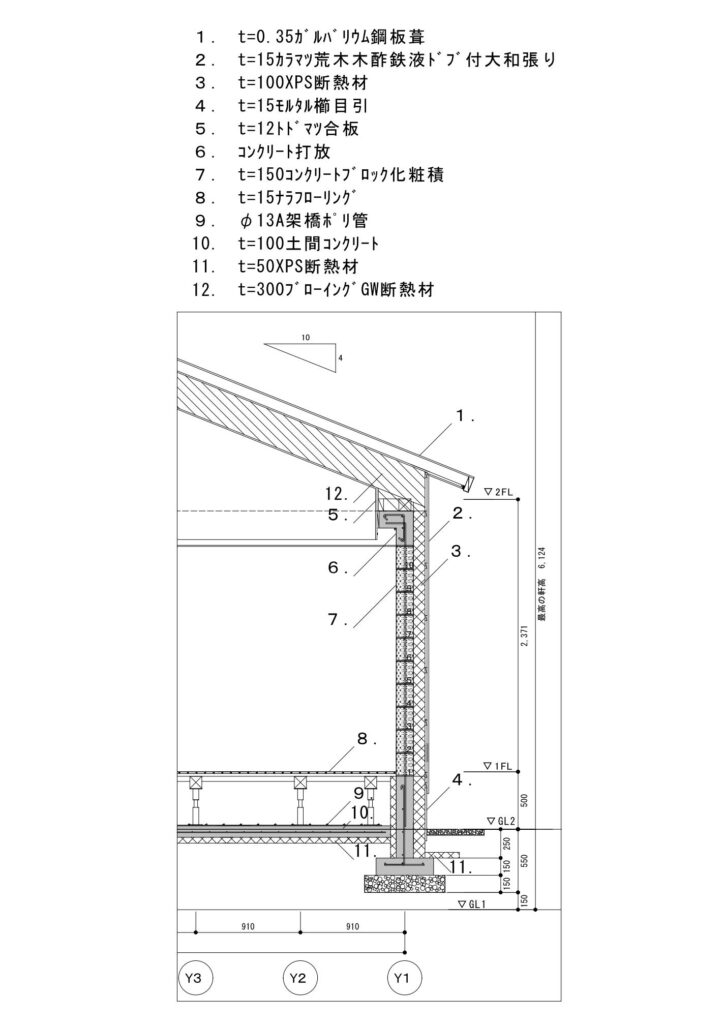 私のような住宅設計監理を主戦場としている建築家の眼には、近年の着工件数の減少や工事費の高騰が映し出す光景が必ずしもバラ色ではないように感じています。特に新築戸建て住宅が激減するという将来予測に対しては、心の準備が必要だと思います。建築の長い歴史の中で住まいは生きていくうえで必要な環境として、さまざまな分野で科学的に研究されてきました。近年、暑さ寒さから住まい手を守るシェルターとしての機能は格段の進歩を遂げています。またセンスの良いデザインや快適さを感じさせるプランなど、設計力と施工精度の平均値が向上したことで適切な住宅が用意されています。しかしそれでもなお不安がよぎります。それは、それらの適切な住宅を誰でもが手に入れることができるのだろうかと疑問に思うからです。かつてはローコスト住宅というカテゴリーがありました。それは、平均的な購買層が無理なく手に入れることができるように、コストを抑えるためのさまざまな設計及び施工上の創意工夫が込められた住宅でした。歴史を振り返るとコンクリートブロック住宅もまたそうした意匠性と機能性を兼ね備えた、しかもリーズナブルな価格帯のローコスト住宅がスタートでした。普段は外部に使用するコンクリートブロック素材を、構造体兼仕上げ材として素地のまま用いたのです。その結果、無機質な表情は「まるで倉庫のようだ」との冷ややかな反応を耳にしながらも1980~90年代の北海道では、多くのコンクリートブロック住宅が誕生しました。当時の主流は断熱材を中央にはさみ込みコンクリートブロックを2重積みする工法でしたが、いまは高級仕様です。そうした状況で私が近年試みている住宅設計は、基礎はコンクリートブロック造、壁を補強コンクリートブロック造、屋根を木造とするハイブリッドな外断熱工法です。これは、工事費とデザインの両面から、また温熱環境の優れた、ことに北海道では私たちが目指すべき方向にある「手頃な住宅」と考えています。