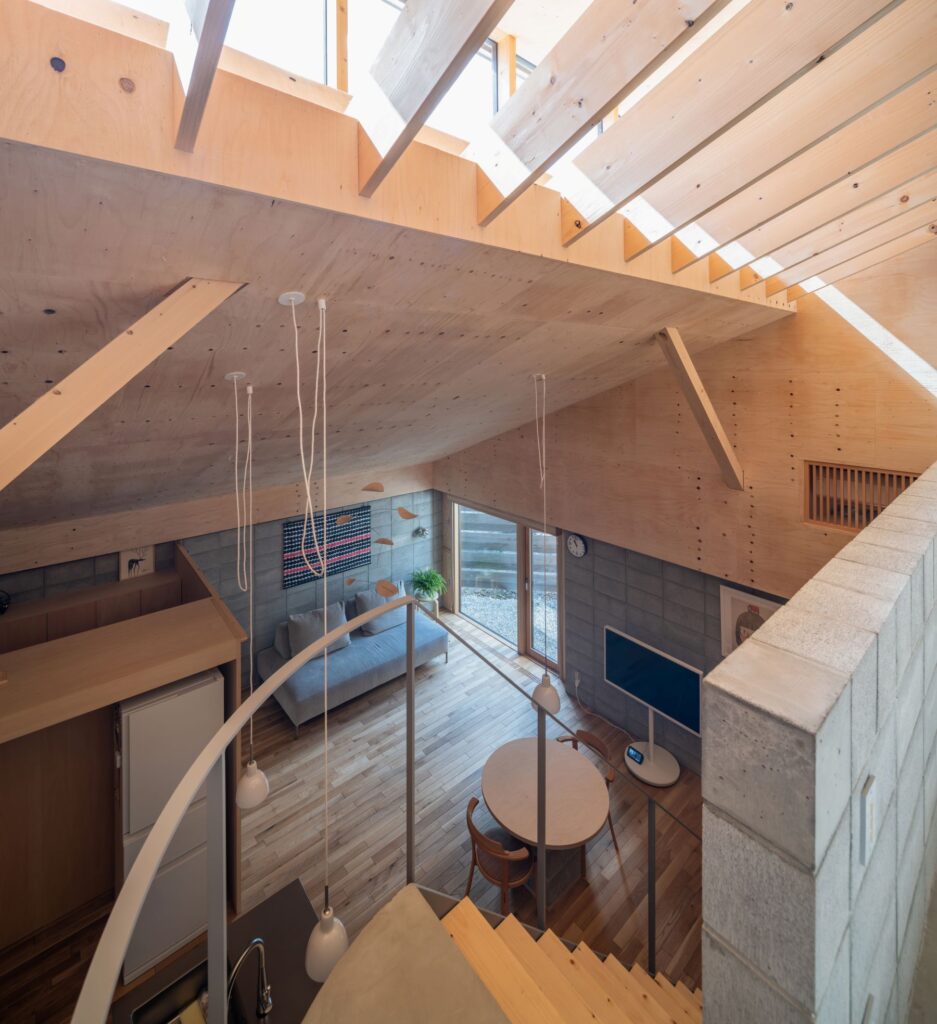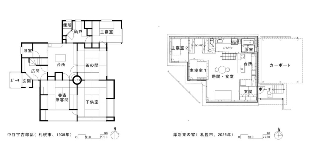 私が暮らす北海道の冬は、雪が大地を純白に彩り美しい光景を見せてくれる季節です。いつの頃からか私は、伊藤整の詩集「雪明かりの路」と中谷宇吉郎のエッセイ「雪」を本棚から手に取り、寒さ厳しい風土に身を置きながら生まれた表現に触れるようになった。調べると、雪研究で高名な中谷宇吉郎博士は、1939年に札幌市内に自邸を建てている。外観は三角屋根で外壁はモルタル仕上だという。しかし断熱材などない時代、木造住宅の外壁だから、室内は決して暖かくはなかっただろう。札幌の2月は極寒地だ。さらに平面図も出てきたので、私は簡略図面に整え直し読み込むことにした。平面計画は田の字プランで廊下が無く、中央部に当時流行したレンガ造のペチカ暖房を設置している。主要室の床はタタミ敷で、米国からの帰国直後にもかかわらず和風なのは、学生たちが寝泊まり可能な床座の合理性を優先したという。その合理精神は台所のアイランドキッチンに反映され、87年前とは思えない新しさに驚くのです。そこで、私が設計した「厚別東の家」との比較を試みた。同じ縮尺で並べてみると、さまざまなことが読み取れて興味深い。「厚別東の家」は、通りや広場のような役割をもつ中央室を中心に計画された住宅(本コラム「住宅の通り・広場」2025年10月20日号)。いわば合理性を追求した平面は、ハイサイドライト採光と床下暖房設備、そして高い断熱気密性能が大きな役割を果たした。そのため、そうした技術的諸条件が用意される時代まで実現できなかったと考えています。そしてもうひとり伊藤整は最晩年、私が高校生時代に講話を聴いているのですが、その内容は残念ながら記憶にない。また東京の自邸「伊藤整の住宅」はブロック造で、2020年登録有形文化財となっています。